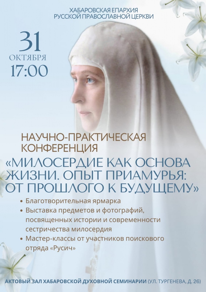 31 октября 2025 в актовом зале Хабаровской духовной семинарии пройдет историческая конференция «Милосердие как основа жизни. Опыт Приамурья: от прошлого к будущему», организованная Хабаровской епархией Русской Православной Церкви.